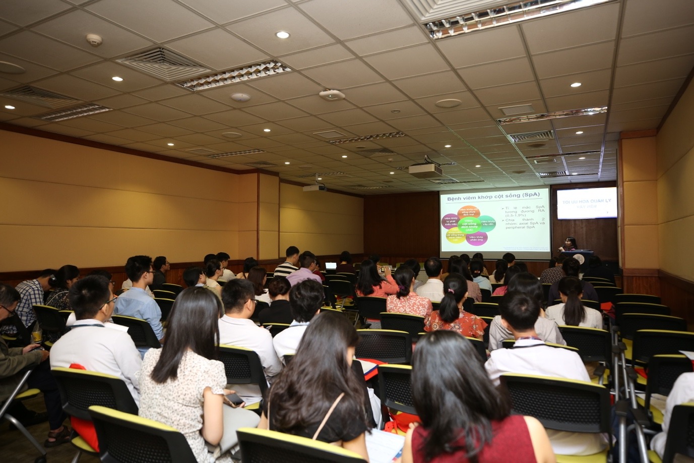 Các học viên chăm chú theo dõi các bài báo cáo với những thông tin cập nhật và bổ ích, rất nhiều câu hỏi đã được đặt ra cho Chủ toạ đoàn và các Báo cáo viên. Đông đảo các bác sĩ, học viên chuyên khoa Da liễu, chuyên khoa Nội khớp đã tham dự khoá học với tinh thần rất hào hứng.